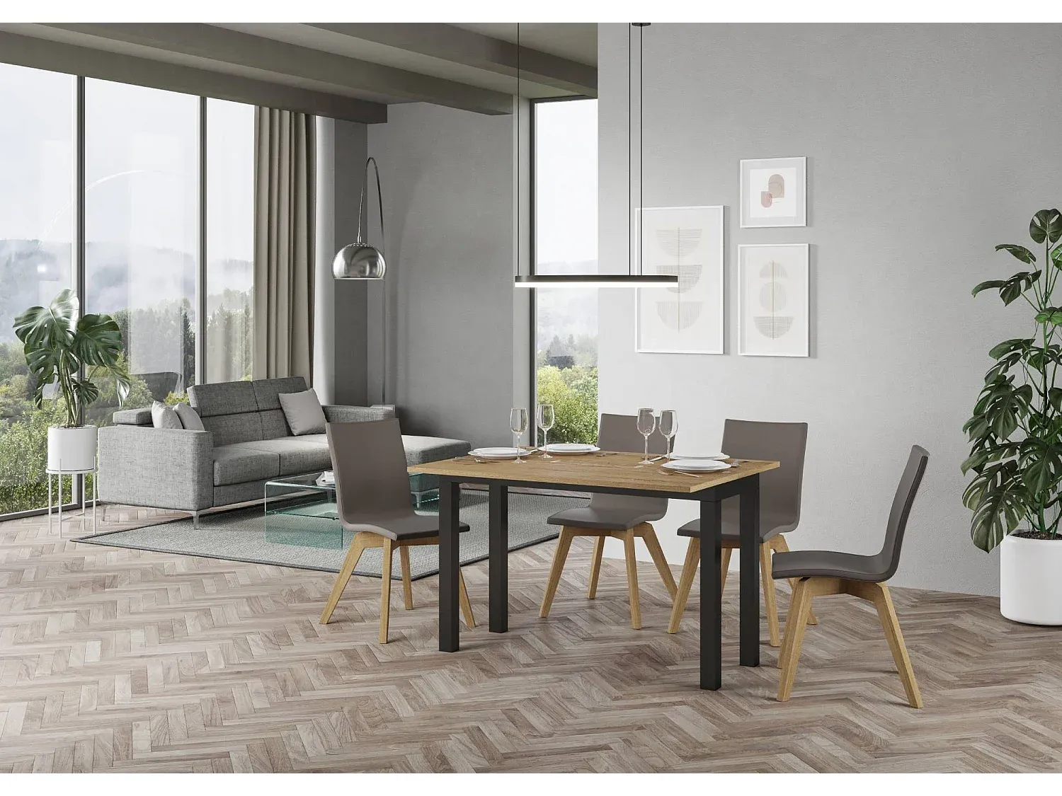 Verlängerbarer Esstisch in Eiche Natur mit Eisenrahmen