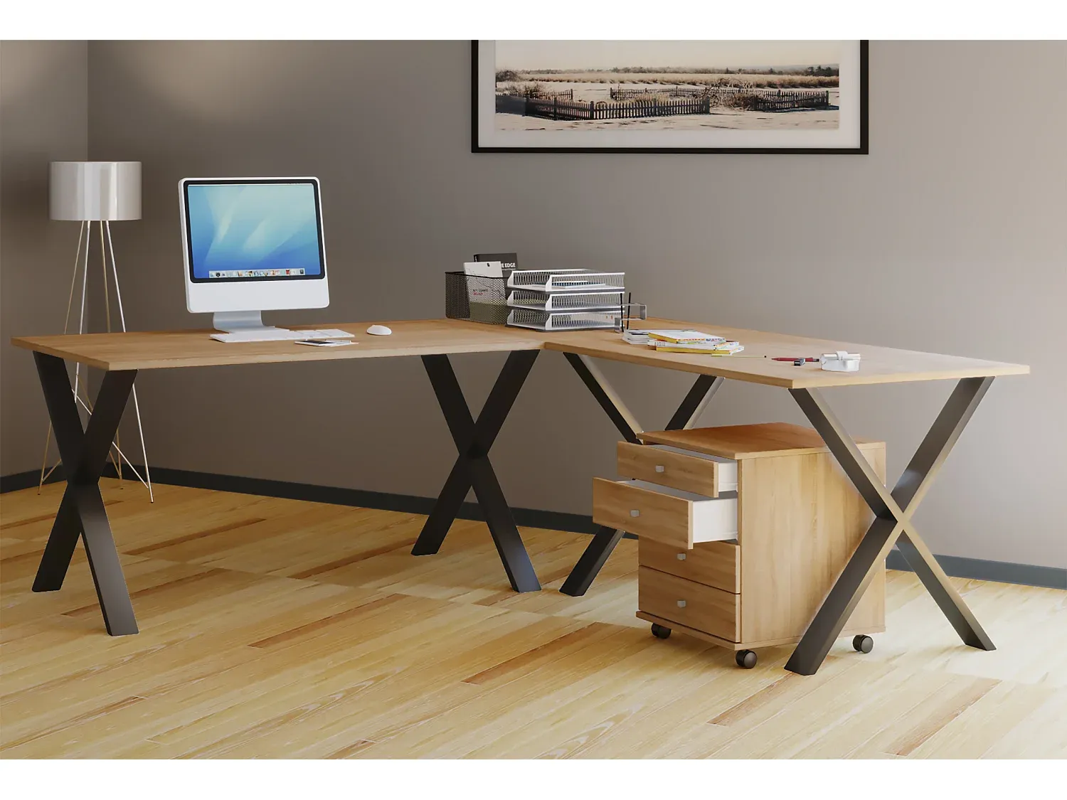 Der Eckschreibtisch in Holzstruktur-Nachbildung bietet eine geräumige Arbeitsfläche. Die Tischplatten sind flexibel montierbar, und die Tischfüße bestehen aus Metall. Es gibt passende Büroschränke und Rollcontainer.