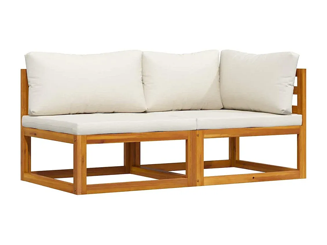 Dieses Sofa-Set aus Holz ist für den Innen- und Außenbereich geeignet. Es besteht aus einem stabilen Akazienholzrahmen. Das Holz wurde mit Öl behandelt, was es widerstandsfähig gegenüber Außenbedingungen macht. Die Sitz- und Rückenkissen sind gepolstert. Es besteht aus einem Eck- und einem Mittelelement, die mit anderen modularen Sofaelementen kombiniert werden können. Kissenfarbe: Cremeweiß. Material: Massives Akazienholz mit natürlichem Finish, Stoff (100% Polyester). Abmessungen des Ecksofas: 70 x 70 x 60 cm (B x T x H). Abmessungen des Mittelsofas: 68 x 70 x 60 cm (B x T x H). Sitzkissen-Dicke: 6 cm. Rückenpolsterdicke: 6/10 cm.