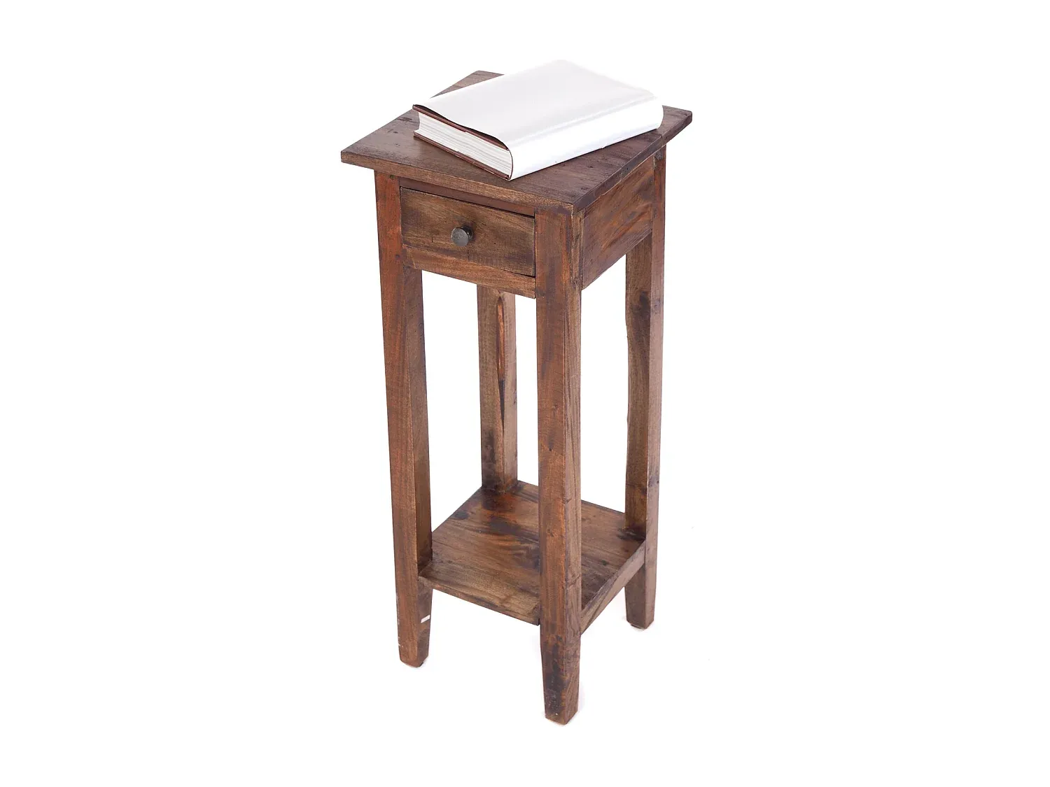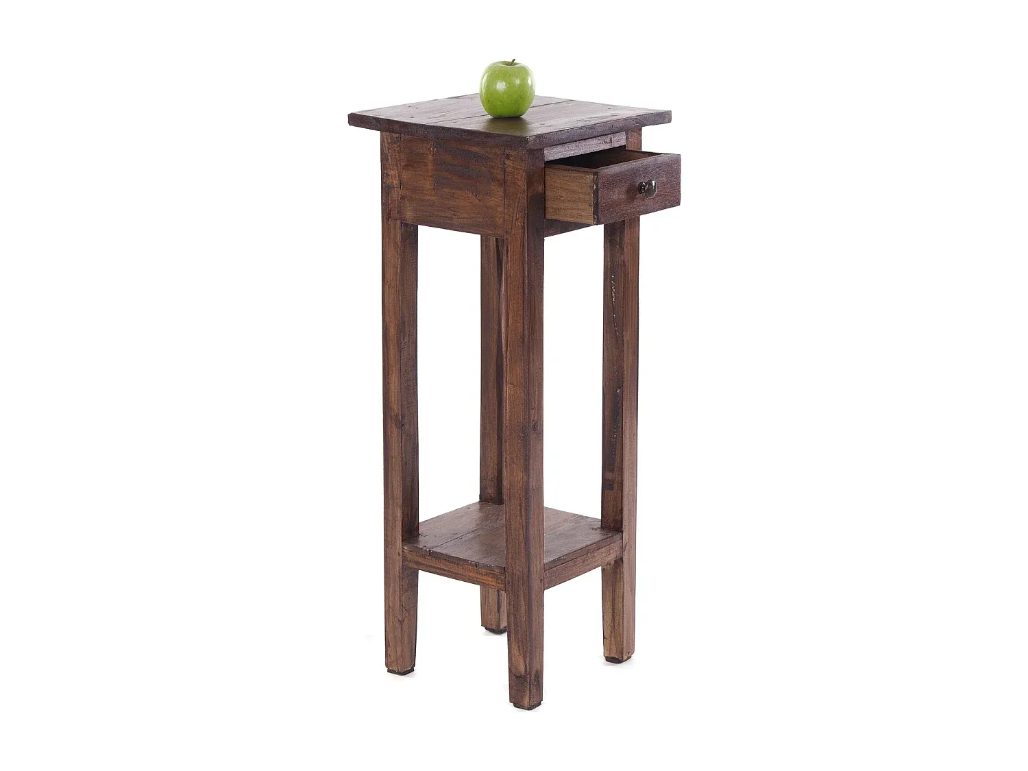 Der Telefontisch bietet vielseitige Einsatzmöglichkeiten. Hergestellt aus Vintage-Holz, betont das Design den rustikalen Charakter. Unregelmäßigkeiten im Holz unterstreichen den besonderen Look. Der Tisch verfügt über zwei Ablagefächer und eine Schublade für zusätzlichen Stauraum. Farbabweichungen oder Unebenheiten können auftreten, da es sich um ein handgefertigtes Produkt handelt. Abmessungen (ca.): Höhe: 75 cm, Breite: 30 cm, Tiefe: 30 cm. Abmessungen Schublade (ca.): Höhe: 4 cm, Breite: 14 cm, Tiefe: 16,5 cm.