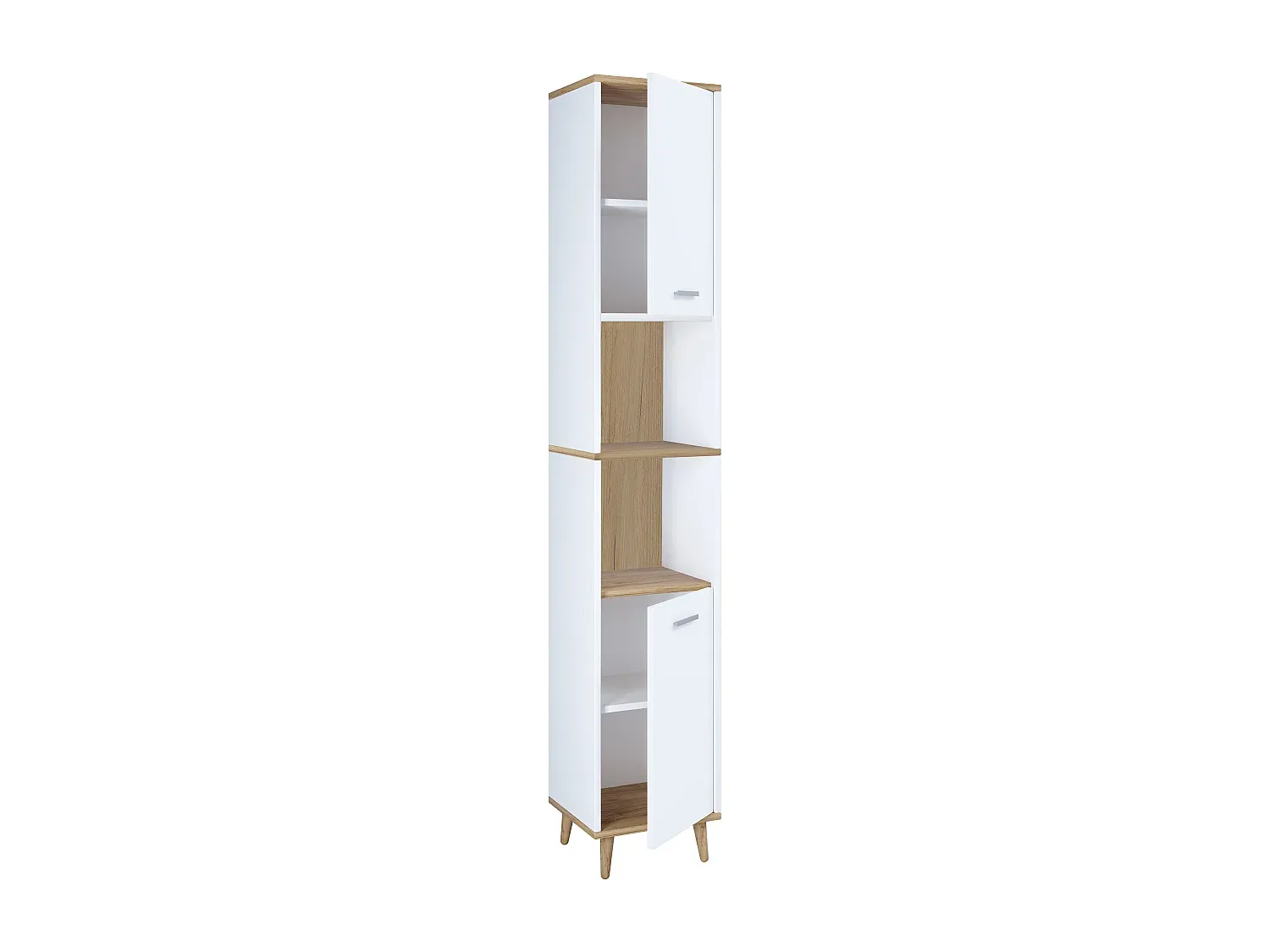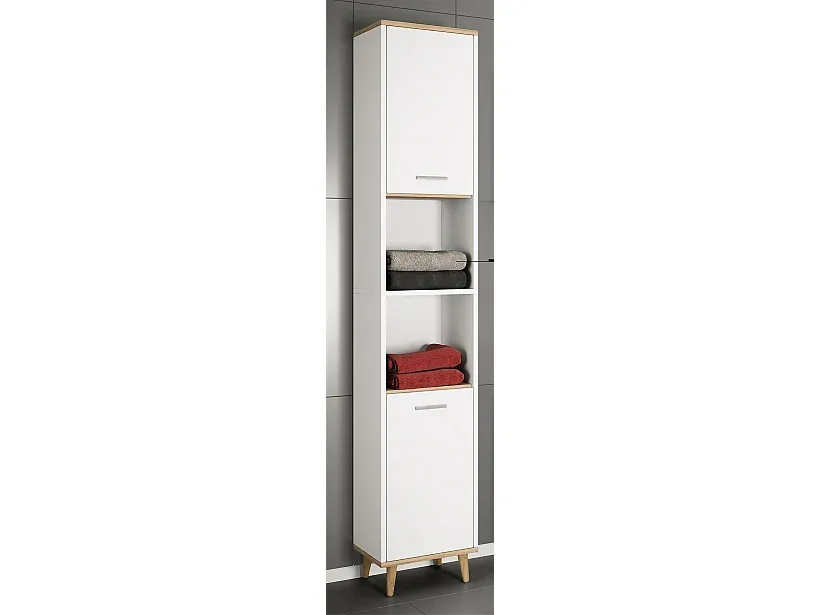 Der Badezimmerschrank besitzt Maße von ca. H. 181 x B. 32 x T. 28 cm. Ohne Füße betragen die Maße ca. H. 171 x B. 32 x T. 28 cm. Er verfügt über zwei offene Fächer sowie zwei Drehtüren mit jeweils zwei Fächern. Die Beschläge sind aus Metall. Das Design ist schlicht. Der Hochschrank hat eine Melamin Beschichtung, die pflegeleicht und feuchtigkeitsbeständig ist.