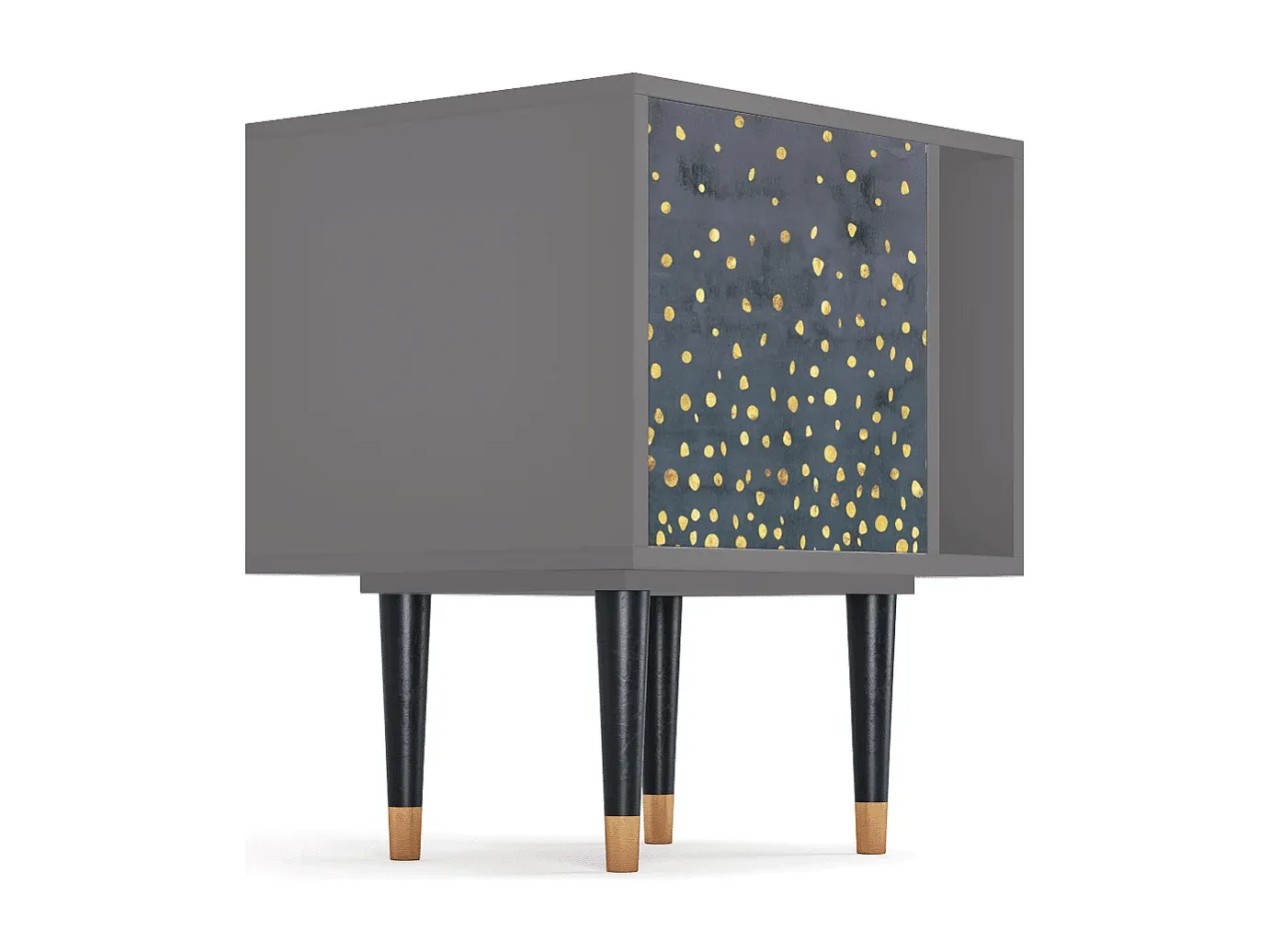 Dieser vielseitige Schrank eignet sich für unterschiedliche Verwendungen wie die Aufbewahrung von Schallplatten oder als Nachttisch. Er ist kompakt gestaltet und passt sich gut verschiedenen Einrichtungsstilen an. Die Front ist präzise verarbeitet, mit UV-Druck versehen und die Oberfläche ist lackiert, um Schutz vor Kratzern zu bieten. Das Möbelstück steht auf stabilen Holzbeinen mit Metallelementen. Es bietet eine Funktionalität als Schrank mit Schwingtür und ist aus Spanplatten gefertigt. Die Konstruktion erfordert Selbstmontage.