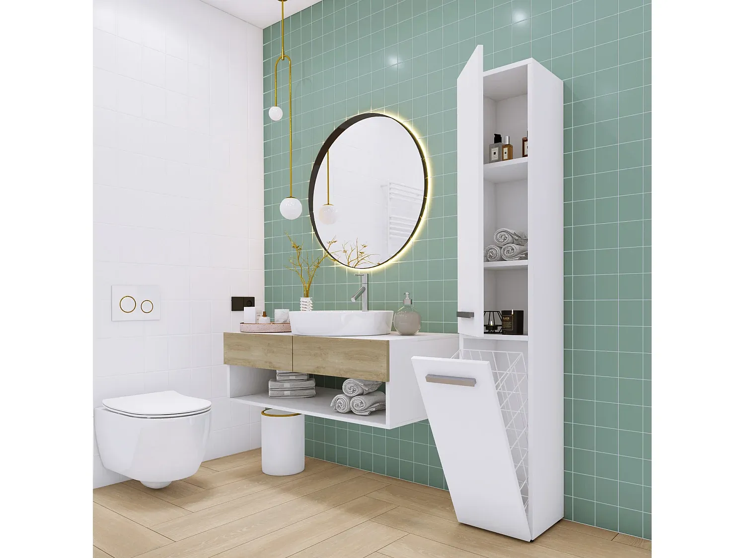 Praktischer Badezimmerschrank mit minimalistischem Design. Verfügt über 3 Regale zur Organisation von Badezimmerartikeln. Optional mit integriertem Korb erhältlich. Vier verschiedene Modelle stehen zur Verfügung, darunter auch offene Regale. Der Schrank ist aus Holzplatte und Holzderivaten gefertigt, mit einer Stärke von 16 mm. Geeignet zur Bodenaufstellung. Maße: Breite: 30 cm, Höhe: 174 cm, Tiefe: 30 cm. Farbe: Weiß.