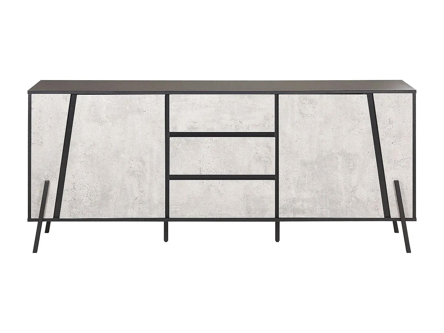 Sideboard in Betonoptik mit praktischem Stauraum. Dieses Möbelstück bietet Platz für Dokumente und Wohnaccessoires hinter Schubladen und Türen. Merkmale umfassen schlichte Form und schräge Metallfüße. Die Oberfläche ist in einem matten Finish gehalten. Maße: 40 cm Tiefe, 177 cm Breite, 75 cm Höhe. Spanplatte und Metall werden als Materialien verwendet. Montage erforderlich.
