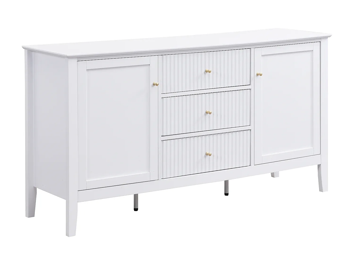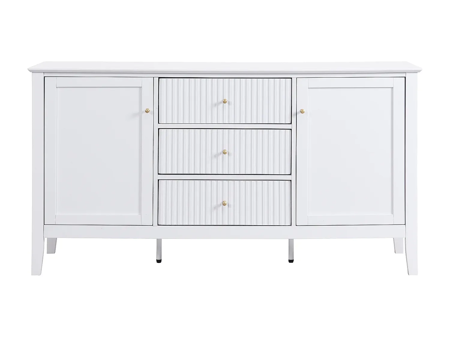 Diese Möbelserie bietet ein schlichtes Design mit feinen Details wie goldfarbenen Griffen. Die Schubladenfronten sind geriffelt und verleihen dem Möbelstück eine besondere Tiefe.