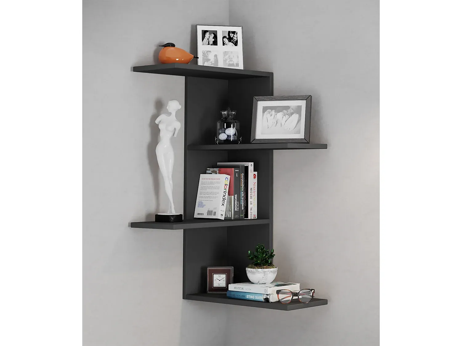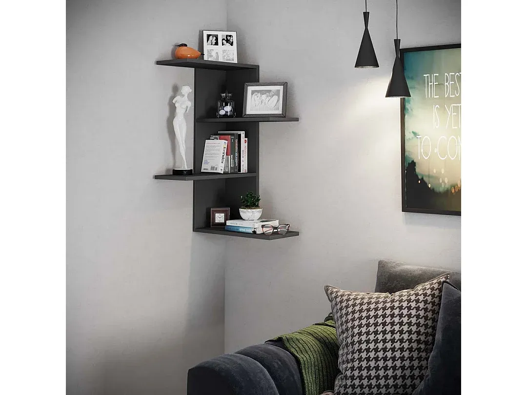 Dieses Wandregal bietet Platz für CDs, DVDs, Bücher und Dekoartikel. Es verfügt über stabile Einlegeböden und kann einfach an der Wand montiert werden. Das Regal hat die Maße ca. H. 77 x B. 45 x T. 45 cm. Es ist in der Farbe Schwarz erhältlich und besteht aus Holz. Zum Aufhängen geeignet und als Ecklösung nutzbar.