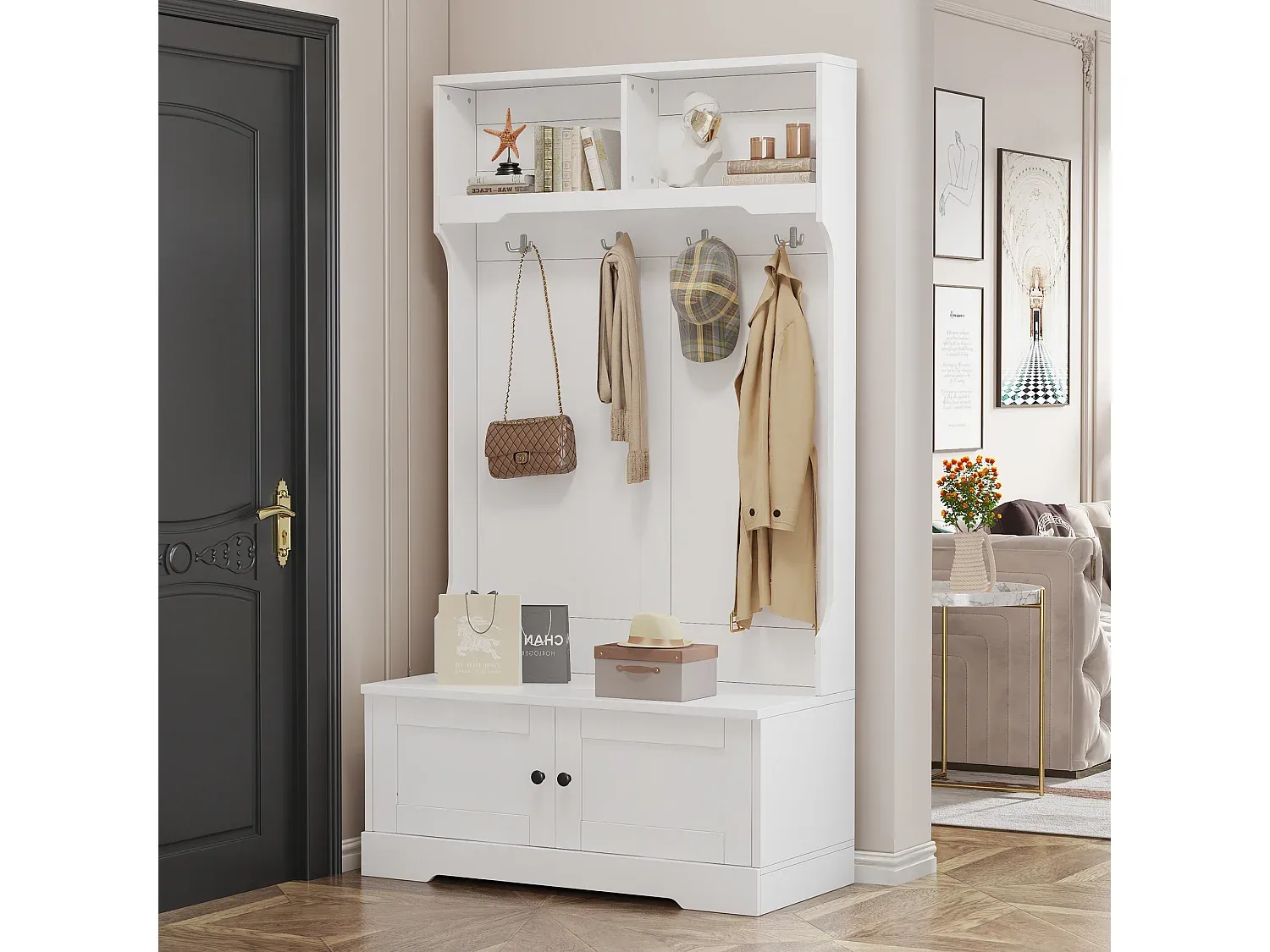 Diese Garderobe bietet eine Sitzgelegenheit mit Stauraum darunter. Die Soft-Close-Scharniere ermöglichen leises Öffnen und Schließen. Zwei obere Fächer bieten Platz für Dekorationsartikel. Vier Haken in der Mitte eignen sich zum Aufhängen von Mänteln und Taschen. Der zweitürige Schrank hat eine weiße Außenseite und bietet versteckten Stauraum für Schuhe.